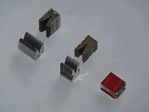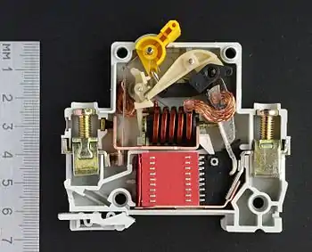 ![]() Дугогасна камера (позначена «*») з деіонною ґраткою у конструкції автоматичного вимикача *