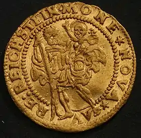 - німецький (вперше випущений в Імперії в 1511 році, в 1559 році прийнятий за основну золоту монету Імперії) — із зображенням правителя;