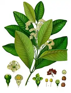 Листки овальні, гострокінечні, супротивні, черешкові, сизого забарвлення. Квіти дрібні, зеленкувато — білі, зібрані в галузку.