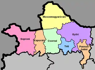 | 6 | Шопронський яраш | Soproni járás | Шопрон | 39 | 3 | 100155 | 867,75 | 115 | |