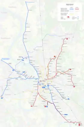 В місті 11 постійно діючіх ліній, більшість з яких виходить за межі міста та сполучає Дюссельдорф з найближчими містами Нойс, Мербуш, Крефельд, Дуйсбург та Ратінген що входять до округу Дюссельдорф. В системі 22 підземні станції; 16 у Дюссельдорфі та 6 у Дуйсбурзі. Центральний тунель відкритий у 1988 році має 4 колії. Доповнює систему мережа трамвайних маршрутів довжиною 78 км зі 178 зупинками.