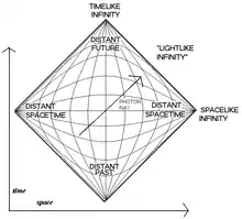 Прямі лінії, що відповідають сталому часу та координаті є гіперболами, що виникають та збігаються в кутах діаграми. Ці точки являють собою "конформну безкінечність" для простору та часу.