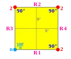 Групи Коксетера на евклідовій площині з відповідними діаграмами. Дзеркала позначені як вузли графу R1, R2, і т. д. та розфарбовані відповідно до порядку відображення. Відображення на 90 градусів нічого не змінюють, а тому видалені з діаграми. Паралельні відображення відзначені символом ∞. Призматична група x зображена як подвоєння , але вона також може бути створена як прямокутні області, отримані з подвоєння трикутників . є подвоєнням трикутника .
