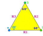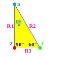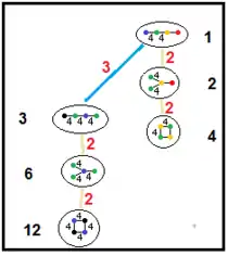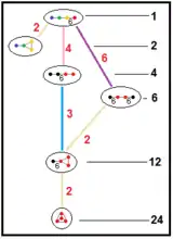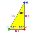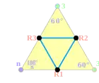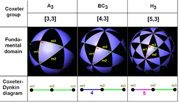 ![]() Групи Коксетера в тривимірному просторі з відповідними діаграмами. Дзеркала (трикутні грані) позначені протилежними вершинами 0..3. Гілки пофарбовані відповідно до порядку відображень. заповнює 1/48 частин куба. заповнює 1/24 частин куба. заповнює 1/12 частин куба. |
