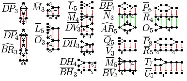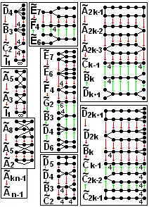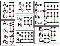 - Для кожної групи наведені три різних позначення — буквено-цифрове позначення, набір цифр в дужках і діаграма Коксетера.