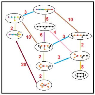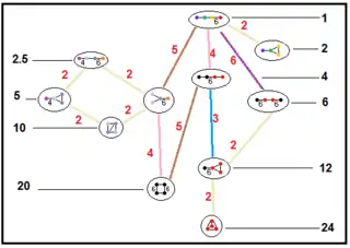 Схема Коксетера — Динкіна (з простими зв'язками[11], скінченна, [ Афінні групи Коксетера | афінна]] або гіперболічна), що має симетрію (задовольняє одній умові), може бути перетворена за допомогою симетрії в нову, в загальному випадку багатониткову схему, за допомогою процесу, званого «згорткою»[12][13].
