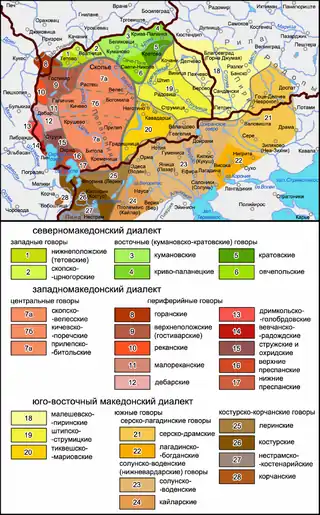 Діале́кты македо́нскої мови (мак. дијалекти на македонскиот јазик) — територіальні різновиди македонської мови, поширені в Вардарскій Македонії (в Північній Македонії і прилеглих до неї з заходу районах Албанії), в Піринській Македонії (на південному заході Болгарії) і в Егейській Македонії (на півночі Греції)[4][5]. Виділяються три основних діалектних райони: західномакедонський, східномакедонський та північномакедонський[6][7][8]. Раніше диалектологи поділяли македонський діалектний ареал на дві частини — західну і східну [9]. Разом з болгарськими і торлацькими, македонські діалекти утворюють болгарсько-македонський безперервний діалектний континуум[10][11].