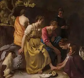 У " Метаморфозах " Овідія[16] згадується, що безпосередньо перед тим, як виявити вагітність Каллісто, Діана вимила ноги, а потім вона та її супроводжуючі розійшлися.[5] Вальтер Лідтке зазначає, що німфа, яка стоїть дещо осторонь групи, зі стиснутими руками перед животом, можливо, на відміну від німфи, яка демонструє відданість і вірність миття ніг, може бути Каллісто . Тоді ця сцена проілюструє частину цього оповідання про міфи, запевняє Лідтке[17] хоча Вілок зазначає, що епізод, здається, не пов'язаний з настроєм картини.