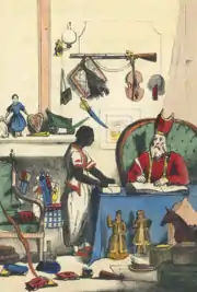 ![]() Сінтаклаас і Чорний Піт. Перше зображення слуги святого Миколая, 1850 |