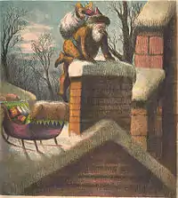 ![]() Санта-Клаус з подарунками влазить до хати через димар. Томас Наст, 1869 рік | |