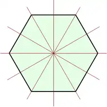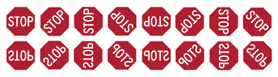 Правильний многокутник з n сторонами має 2n різних симетрій: n обертальних симетрій і n осьових симетрій. Пов'язані обертання і відбиття утворюють діедральну групу Dn. Якщо n непарне, тоді кожна вісь симетрії поєднує середину сторони і протилежну вершину. Якщо n парне, тоді існує n/2 осей симетрій, які поєднують протилежні вершини. Так чи інакше, існує n осей симетрії і 2n елементів у групі симетрій. Відбиття відносно однієї з осей симетрії із наступним відбиттям відносно іншої осі рівноцінно обертанню на подвоєний кут між осями. Наступне зображення показує 16 елементів групи D8 для знаку «Stop»: