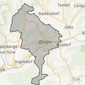 | Комуна Дікірх (помаранчевий), кантон Дікірх (темно-червоний) та округ Дікірх (темно-сірий) на карті Люксембургу | ||||