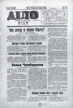Ді́ло — провідний часопис Галичини, її перший, найстаріший і впродовж багатьох років єдиний український щоденник (перше число було видано друком у Львові 1 січня 1880 року[1]); офіційний орган УНДП і УНДО. На початку 1920-х через цензурні переслідування видання часто змінювало назву: «Громадська думка», «Українська думка», «Український вістник», «Громадський вістник», «Свобода».