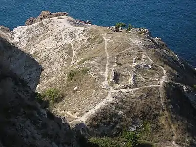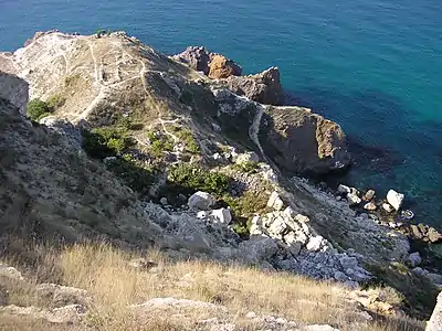 На пасмі скелі оголюються кам'яні конструкції та культурні нашарування двох античних земельних ділянок № 312 і 313, частково зруйнованих береговою ерозією[1].