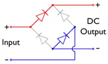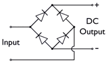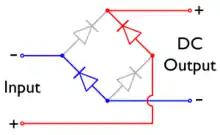На вхід (Input) схеми подається змінна напруга (зазвичай, але не обов'язково синусоїдальна). У кожний з півперіодів струм проходить тільки через два діода, два інших діода — замкнені: