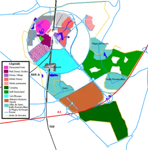 Парк налічує сорок дев'ять атракціонів у п'яти тематичних «землях». Залізнична колія проходить по периметру парка і має зупинки на Main Street, USA, Frontierland, Fantasyland і Discoveryland. Дороги до різних частин розходяться від центру, де розташований замок Сплячої красуні «Le Château de la Belle au Bois Dormant».
