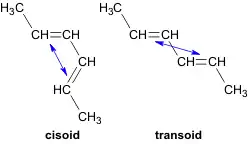 Спряжені дієни можуть мати цис- і транс-конформації відносно проміжного одинарного зв'язку, які здатні переходити одна в одну. Стійкішою є транс-форма.