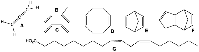 - 1. Кумульовані, у яких подвійні зв'язки — суміжні, також відомі як алени. Кумульовані дієни — хімічно інертні.