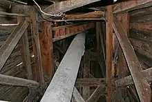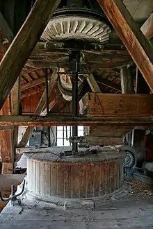 Млиновий постав з жорнами знаходиться суворо по центру башти. Для зручності обслуговування обладнання башта дещо зміщена до задньої стінки будівлі.
