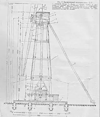 Дерев'яна башта вітродвигуна являє собою чотиригранну ґратчасту зрізану піраміду, що складається з чотирьох обтесаних колод (ніг), з'єднаних поясами та хрестовинами із брусів прямокутного перерізу. Башта встановлюється на підвалинах будівлі та кріпиться до них і, до закопаних в ґрунт стояків, металевими скобами. На вершині башти знаходиться дерев'яне кільце, яке є опорою для рами поворотного шатра. Для зменшення тертя між дерев'яним кільцем та рамою поворотного шатра, укладена сталева смуга, що приєднується до кільця металевими болтами.