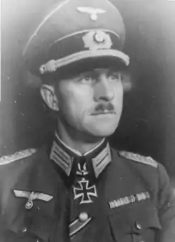 - Лицарський хрест Залізного хреста, отриманий 4 жовтня 1944 у званні Оберста та будучи командувачем 980-го гренадерського полку[1]