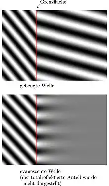 Схематичне зображення полів заломленої хвилі (верхній рисунок) і еванесцентного поля (нижній рисунок) при повному внутрішньому відбитті