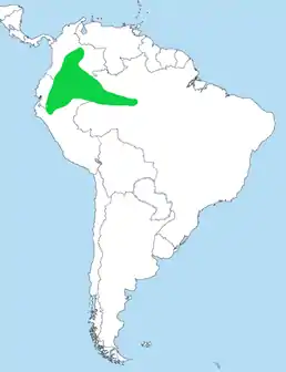 Вид поширений в Південній Америці. Трапляється в Колумбії, на сході Еквадору, півночі Перу та заході Бразилії. Живе в тропічному дощовому лісі та нижньому монтанному лісі, від рівня моря до 1375 м.[3]