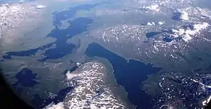 ![]() Озеро Еверуман (ліворуч). Фото з літака, вид з заходу на схід. | ||||