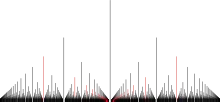 Перспективне зображення саду Евкліда з початку координат. Червоні «дерева» зображають друге дерево від початку.
