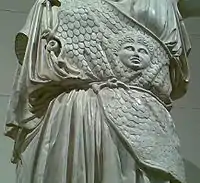 Афіна іноді користувалась егідою батька. Післягомерівські перекази пов'язують егіду зі шкурою кози Амальтеї. Під час боротьби з титанами Зевс натягнув на щит шкуру своєї годувальниці і прикріпив до нього голову Медузи. За іншою версією, егіда — народжений землею демон, що викидав полум'я й пустошив багато країн. Афіна вбила його, з шкури страховища зробила щит. Згодом егіда пов'язується з Афіною і стає невід'ємним атрибутом богині — щитом або обладунком зі зміями та головою горгони Медузи. В епосі вона «блискуча» або «темна», «нездоланна», «така, що наганяє страх». Імовірно, що егіда — результат обожнювання стародавніми греками грізних явищ природи, символ грозової хмари.