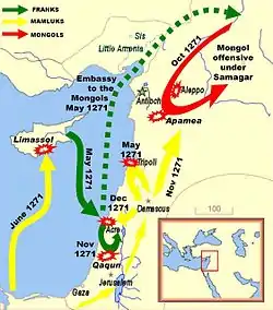 До того часу ситуація у Святій землі залишалась нестабільною. Єрусалим знову здався 1244 року, а Акра була центром християнської держави[51]. Мусульманські держави перейшли в наступ під командою мамелюка Бейбарса й нині вони загрожували Акрі. Хоча люди Едуарда стали важливою частиною гарнізону, у них були лише невеликі шанси вистояти проти сил Бейбарса, що переважали. Первинний рейд проти близького Сент-Джорджа виявився марним[52]. Християни відрядили посольство до монголів і ті здійснили атаку на Алеппо на півночі, що допомогло відволікти Бейбарса[53]. У листопаді Едуард здійснив рейд на Какун, що допомогло утримати плацдарм в напрямку Єрусалима, але в підсумку монгольський наступ і рейд на Какун провалились. Становище здавалось все більш безнадійним й у травні 1272 року король Кіпру Гуго III, що був одночасно королем Єрусалиму, підписав десятилітнє перемир'я з Бейбарсом[54]. Спочатку Едуард проігнорував перемир'я, але замах з боку мусульманського асасина в червні змусив його облишити участь у будь-яких подальших кампаніях. Хоч Едуард і зумів вбити ассасина, його було поранено ударом кинджала в руку, можливо, кинджал було отруєно й Едуард упродовж наступних місяців серйозно хворів[~ 7].