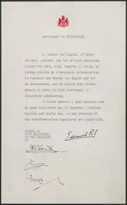 Не бажаючи державі кризи і можливого розпаду і твердо бажаючи одружитися з коханою жінкою, Едуард вибрав останній варіант. Був підготовлений закон про порядок зречення, указ про введення котрого в дію Едуард підписав 10 грудня 1936 року у своєму замку форті Бельведер, за присутності 3 братів: герцога Альберта Георга Йоркського, герцога Генрі Глостерського та герцога Георга Кентського. Наступного дня він дав формальну згоду (Royal assent) на обнародування акту у всіх домініонах Співдружності, крім Ірландії, котра не побажала з такого випадку скликати парламент і лише 12 грудня підтвердила це рішення; таким чином, протягом 24 годин у Великій Британії та Ірландії були різні королі.
