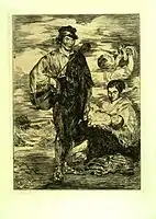 Аби якось популяризувати свої картини, він і звернувся до створення офортів. З серпня 1862 року його приятелі художники Альфонс Легро і Фелікс Бракмон заснували в Парижі «Гурток аквафортистів»[10]. Мане звернувся до призабутої техніки і створив офорти за мотивами своїх творів («Цигани», «Хлопчик з собакою», «Вікторина Меран в костюмі еспади», «Лола з Валенсії», «Прихильник абсенту») і творів Веласкеса. У 1862 році було створено 13 офортів. Малюнки Мане виявились значно цікавішими за його офорти, серед них і «Портрет пані Гійєме», що потрапить в петербурзький Ермітаж лише в 1938 році. Але після друку офортів популярність Мане підвищилася. Сприяла цьому і стаття про майстрів-аквафортистів, надрукована поетом Шарлем Бодлером (1821—1867).