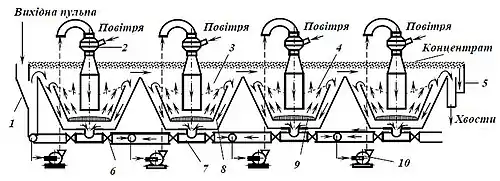Вихідний матеріал надходить у приймальний карман 1, а звідти частково в насос першого ступеня 10, куди також подається певний об’єм камерного продукту (циркуляційне навантаження). Від насоса 10 пульпа підводиться до ежектора 2, з якого аерована суміш по трубопроводу викидається всередину камери 3.