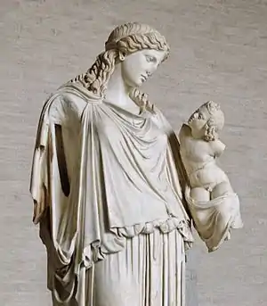 | Атрибути | Ріг достатку, маслинова гілка, жезл Гермес |