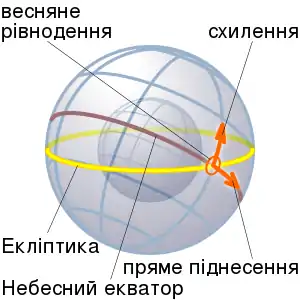 - Прямим піднесенням α світила називається дуга небесного екватора від точки весняного рівнодення до кола схилення світила, або кут між напрямком на точку весняного рівнодення та площиною кола схилення світила.