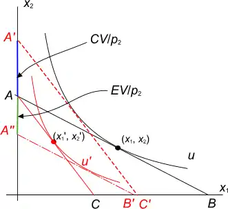 При зміненні відносного рівня цін (змінюється нахил бюджетної лінії AB, тепер це AC) споживач переходить із рівня добробуту u на новий рівень u'. Він би перейшов на цей самий рівень, якби його дохід зменшився на величину, відповідну EV (зсув бюджетної лінії в A''B').