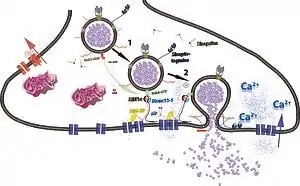 За допомогою Ca2+- залежного екзоцитозу в процесі передавання нервового збудження від клітини до клітини в синаптичну щілину виділяються нейромедіатори із секреторних пухирців[2].