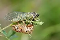 Гірська цикада (Cicadetta montana), яка тільки-но вийшла з екзувію (він поруч з нею)