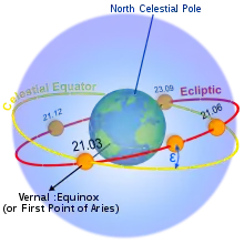 Кут нахилу площини екліптики до небесного екватора дорівнює куту нахилу площини екватора Землі до площини її орбіти й становить близько 23°26’21"[1]. Він піддається невеликим коливанням (нутації) із періодом 18,6 років та амплітудою 18,42", а також іншим незначним коливанням. Точки перетину екліптики з небесним екватором називають точками рівнодення[1].