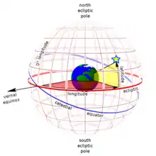 Екліптичною довготою λ світила називають дугу екліптики від точки весняного рівнодення до кола широти світила (кут між напрямком на точку весняного рівнодення й площиною кола широти світила).