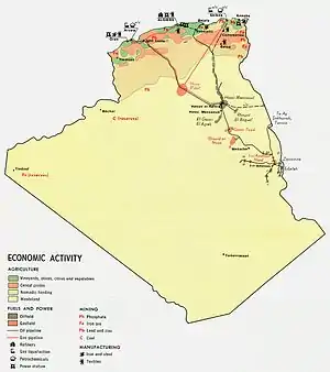 Колонізація в Алжирі тривала довше, ніж в більшості інших північноафриканських країн, що зумовило багатоукладність виробничо-галузевої структури господарства. На захоплених у алжирських селян кращих землях склався сектор високотоварного капіталістичного виробництва, орієнтованого на зовнішній ринок. Деякий розвиток отримали галузі легкої промисловості (текстильна, шкіряно-взуттєва, хімічна, харчова), продукція яких реалізовувалася на алжирському і частково на зовнішньому ринках. Загалом Алжир серед країн Магрибу мав найбільш розвинену економіку, хоча й повністю налаштовану на потреби метрополії[4]. З метою обслуговування колоніального господарства була створена відносно розвинена інфраструктура. Поряд з капіталістичними сферами існувала велика традиційна сфера виробництва, головним чином у вигляді відсталого напівнатурального сільського господарства і підприємств напівкустарного типу. У структурі товарної продукції переважали предмети споживання, проте їх виробництво не покривало попиту і доповнювалось широким імпортом (верстати, машини, устаткування, сировина)[4].