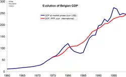 ВВП Бельгії в 1996 оцінювався в 222 млрд дол., або 21 856 дол. на душу населення (для порівняння в Нідерландах — 20 905 дол., у Франції — 20 533, в США — 27 821). Темпи зростання ВВП в 1991—1996 склали в середньому 1,2 % на рік. На особисте споживання в 1995 було витрачено 62 % ВВП, тоді як державні витрати становили 15 %, а 18 % були інвестовані в основні фонди. Структура ВВП: сільське господарство — менше 2 % ВВП, промисловість — 28 %, а сфера послуг — майже 70 %. Ці показники відповідають сучасним європейським стандартам.