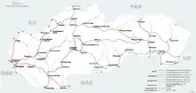 У транспортній залізничній мережі основними є три широтні та п'ять меридіональних ліній. Широтні лінії це: північна, Жиліна-Мартін-Попрад-Пряшів-Гуменне; середня, Зволен-Банська-Бистриця-Брезно-Кошице; південна, Братислава-Нове Замки-Зволен-Рожнява-Кошице-Требішов Меридіональні лінії проходять три на заході і дві на сході. Західні: Братислава-Трнава-Тренчин-Жиліна, Нове Замки-Нітра-Превідза-Мартін та Банська-Бистриця-Мартін. Східні: Кошице-Пряшів та Требішов-Гуменне. Найбільшими транспортно-залізничними вузлами є Братислава та Нітра. Словаччина пов'язана з Україною двома залізничними переходами, Чиєрнанад-Тисов — Чоп та Вельке-Капушани-Ужгород.