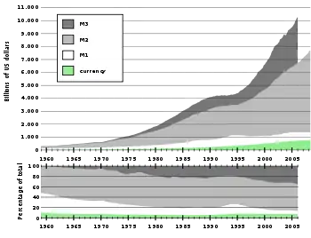 У банківсько-фінансовій справі посилюється концентрація капіталу. У 1997 на території США діяли 9143 банки із загальним капіталом 5 трлн дол. (в середньому по 548 млн дол. в кожному). У 1985 в країні було 14 417 банків із загальним капіталом (в доларах 1997) 3,7 трлн дол. (в середньому по 254 млн дол. в кожному). Банки відіграють величезну роль в економіці країни. У 1996 частка банків, страхових товариств, компаній по операціях з нерухомістю і кредитних організацій в ВВП становила 19 %. Операції з нерухомістю дали 886 млрд дол., депозитні інститути, включаючи комерційні банки, — 247 млрд, страхування — 136 млрд. Федеральна резервна система (ФРС) США контролює обсяг грошової маси в країні й вирішальним чином впливає на фінансові ринки. ФРС ухвалює рішення незалежно від федерального уряду, президент США призначає членів ради керівників на 14-літній термін. Змінюючи обсяг грошової маси, ФРС впливає на розмір процентних ставок. Зменшуючи грошову масу, ФРС підвищує процентні ставки, тим самим знижуючи темпи економічного зростання. Аналогічно, збільшення грошової маси приводить до зниження процентних ставок і стимулює економічне зростання. У 1980-х — на початку 1990-х років ФРС проводила антиінфляційну політику, втримуючи процентні ставки на високому рівні, а темпи економічного зростання — на порівняно низькому рівні.