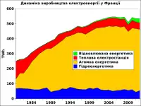 Франція займає 2-е місце у світі (після США) по використанню атомної енергії. У 1997 на частку АЕС Франції припадало 91 % всієї виробленої електроенергії. Власний видобуток вугілля, нафти і газу покриває всього 2 % суми споживання первинної енергії у Франції. В той же час Mining Annual Review 2002 повідомляє, що частка АЕС у 2001 р склала тільки 50 %, що може бути пояснено обережнішим ставленням до ядерної енергетики після Чорнобильської катастрофи. Зростає частка відновлювальної енергетики, зокрема — вітроенергетики.