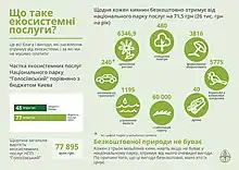 У 2018 році таке дослідження провели екологи Міжнародної благодійної організації «Екологія-Право-Людина»[4]. Дослідження було проведене для Національного природного парку «Голосіївський» та оприлюднене в травні 2018 року[5]. Результатами дослідження стало те, що кожен з трьох мільйонів киян, навіть якщо не буває у національному парку, отримує від нього очевидні власні вигоди, які проходять повз увагу мешканців, зважаючи на те, що платити за такі послуги не потрібно. Якщо спробувати порахувати вартість того, чим завдячуємо лісам Голосіївського нацпарку, то вийде, що кожен мешканець Києва мав би сплачувати щодня близько 70 гривень до державної скарбниці, за роботу, яку дика природа здійснює замість складних технологій. Кияни завдячують цим безкоштовним багатством національному природному парку «Голосіївський».