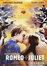 | 1996 | «Ромео + Джульєтта» (Romeo + Juliet) | Баз Лурманн | Ромео — Леонардо Ді Капріо, Джульєтта — Клер Дейнс, Тібальт — Джон Легуїзамо, Меркуціо — Харольд Перріно, священик Лоренцо — Піт Постлетуейт, Фульгенціо Монтеккі — Пол Сорвіно, Тед Капулетті — Брайан Деннехі, капітан Принц — Вонді Кертіс-хол, годувальниця — Міріам Марголіс, Бальтазар — Джесі Бредфорд, аптекар — М. Еммет Уолш, Грегорі — Зак Орт, Самсон — Джеймі Кеннеді, Абрам — Вінсент Лареска, Петруччо — Карлос Мартін Манзо Оталора, Керолайн Монтеккі — Крістіна Піклз, Ґлоріа Капулетті — Дайєн Венора, Пітер — Педро Альтамірано, різник — Джон Стерліні, С'юзан Сантандіанґо — Херрієт Сенсом Харріс, Річ Ранчидіс — Майкл Корбетт, телеведуча — Едвіна Мур, хлопчик з хору — Куїндон Тарвер | США | Екранізація п'єси Вільяма Шекспіра «Ромео і Джульєтта» в сучасній адаптації. Оператор — Доналд МакЕлпайн. Композитор — Ніл Хупер. | ![]() |