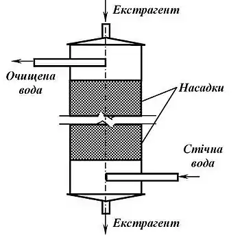 Для рівномірного розподілення екстрагенту по об'єму екстракційної колони її внутрішній простір заповнюють насадками. Екстрагент подають у верхню частину колони. З метою інтенсифікації очищення, екстрагент подають у декількох точках через інжектори, які розпилюють його на дрібні краплі. Швидкість руху стічних вод у колоні має бути на 15—20 % менше критичної, при якій екстрагент виноситься стічними водами з колони.