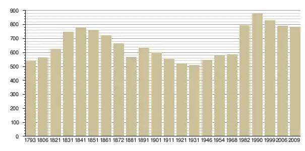 Динаміка населення (base Cassini de l'EHESS pour les nombres retenus jusque 1962[3], base Insee à partir de 1968 (population sans doubles comptes puis population municipale à partir de 2006)[4] · [5] ):